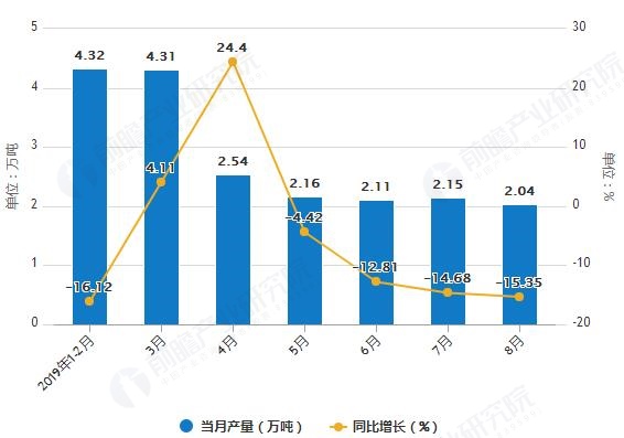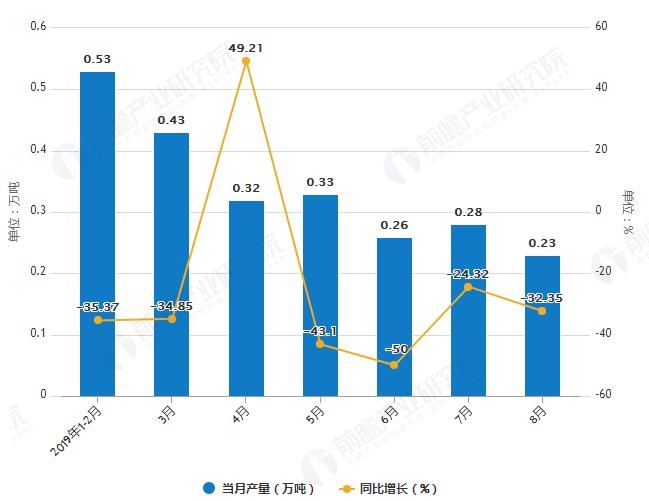據國家統計局統計數據顯示,2019年1-2季度湖南省化學農藥原藥產量波動幅度不大,2019年7月湖南省化學農藥原藥產量為0.28萬噸,同比下降24.32%。2019年1-8月湖南省化學農藥原藥產量為2.49萬噸,...