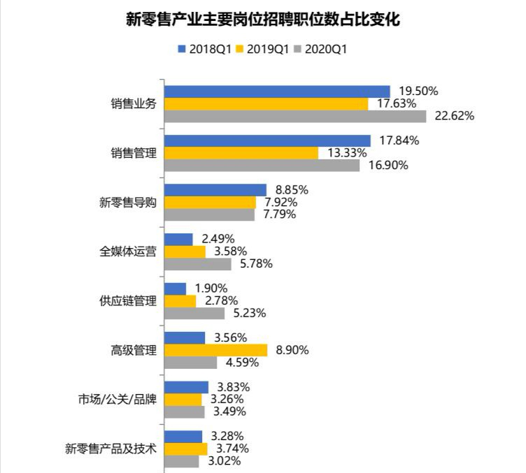 ToB的銷售和ToC的導(dǎo)購是新零售的主體崗位,2020年一季度,銷售業(yè)務(wù)、銷售管理和新零售導(dǎo)購崗位的招聘職位數(shù)分別占新零售總體的22.62%、16.90%、7.79%。全媒體運(yùn)營、供應(yīng)鏈管理等新零售中臺崗位招聘需求保持增長態(tài)勢,2020年一季度招聘職位數(shù)占比較2018年一季度均提高超過3個百分點(diǎn)。
